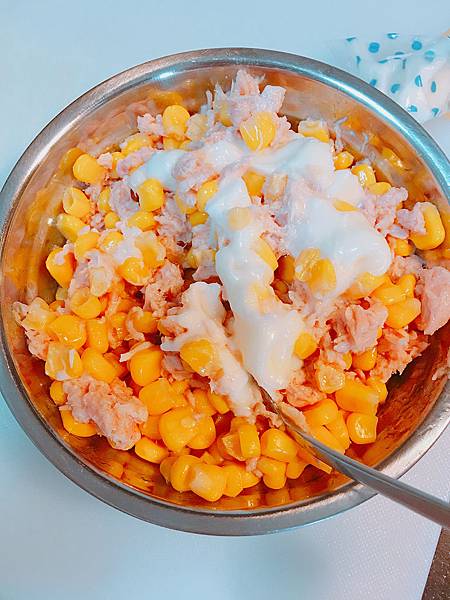 把鮪魚玉米加在一起,最後淋上美乃滋拌一拌就可以了